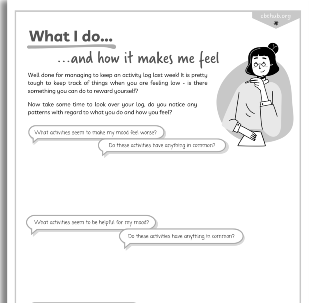 This resource guides young people to reflect on their activity logs as part of the Behavioural Activation process. It encourages clients to identify patterns between their activities and mood, helping them understand which behaviours may be contributing to or alleviating their low mood.